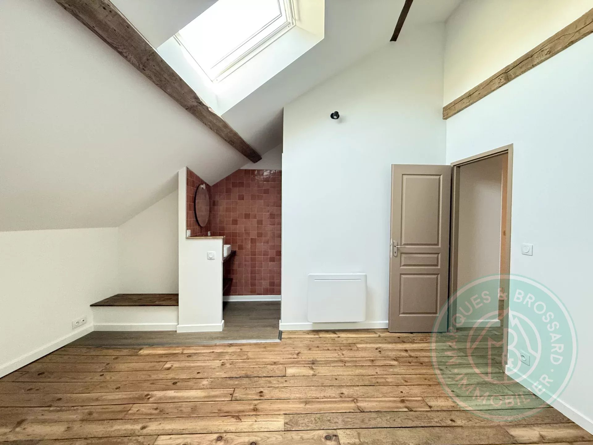 Vous apprécierez particulièrement sa cuisine ouverte sur un séjour avec poutres apparentes et beau parquet. Il dispose de deux chambres et un bureau, de deux salles d'eau et d'un WC.